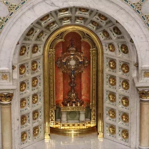 Harmonizing with the architectural scheme of the chapel, the monstrance of exposition is of artistic workmanship. It is Romanesque in style; gold plated over a silver base and thirty inches high. The focus of the Adoration Chapel is the revolving tabernacle supporting the monstrance with the Blessed Sacrament exposed. The platform holds the monstrance on the Adoration Chapel side and the crucifix on the Mary of the Angels Chapel side.