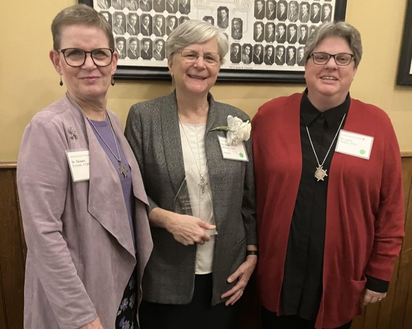Sisters Sue Ernster and Laura Nettles celebrate Sister Katie Mitchell (center), honored for her work with Cabrini Ministries and the Archdiocese of Chicago's St. Frances Xavier Cabrini Award.